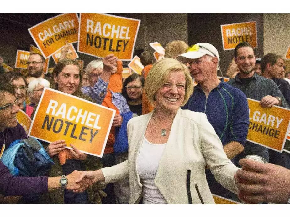 2015年5月2日星期六,在卡尔加里大学MacEwan Hall Ballroom, 阿尔伯塔省新民党领袖RachelNotely正在与她的支持者们微笑握手