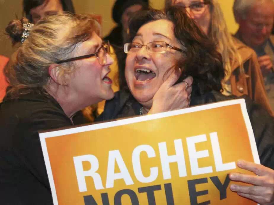 2015年5月5日星期二竞选日,在卡尔加里Arrata 歌剧中心,两位新民党拥护者当看到新民党领袖Rachel Notley出现在电视屏幕中时激动相拥