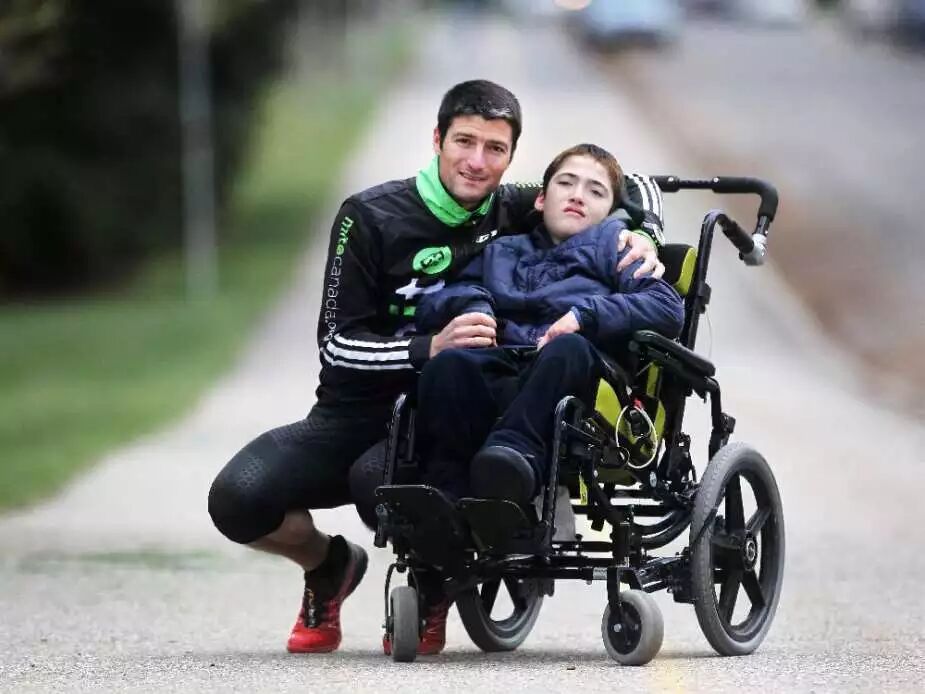 这是摄于2015年5月6日的照片。卡尔加里选手Blaine Penny赢得了周末尼加拉瓜瀑布举行的生命的翅膀65公里世界长跑比赛。他受到他四肢瘫痪的11岁儿子Evan的鼓舞。