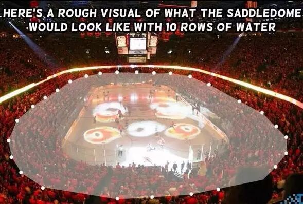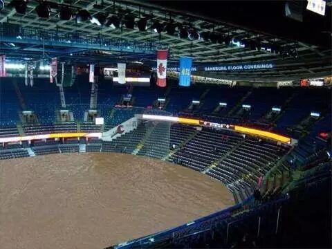 2013年卡城洪水Saddledome是重灾区,水位最高到达底部看台最高处的包厢,大部分电子设备被毁。