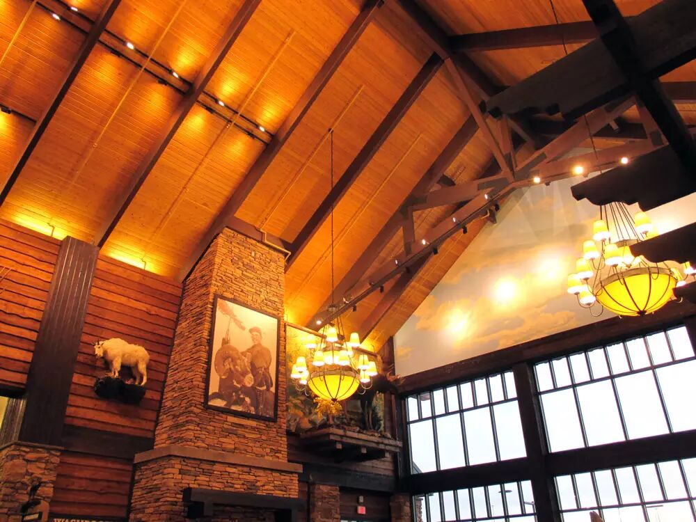 商店的入口处的装修非常象一个渔猎小屋,类似教堂式的天花板,巨大的壁炉和原木的顶梁。