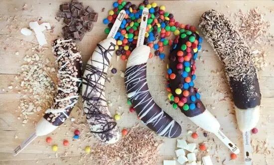冰冻的香蕉浇上巧克力和果仁和糖豆