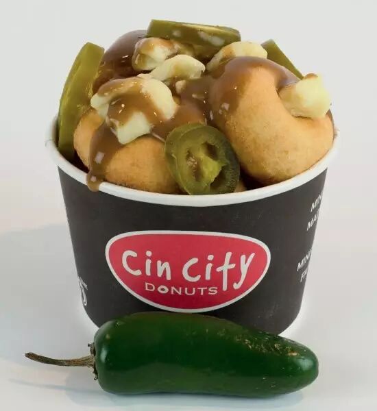 在新鲜出炉的donut上淋有美味的奶酪凝乳,窒息肉汁,和jalapeño辣椒片