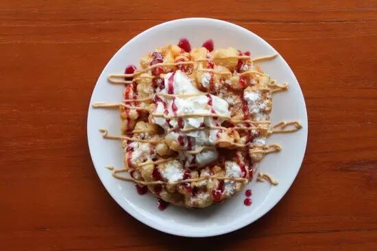 经典新鲜烹制的宾夕法尼亚州的荷兰漏斗蛋糕有鲜奶油和花生酱果酱(小编吐槽:怎么又是花生酱和果酱)