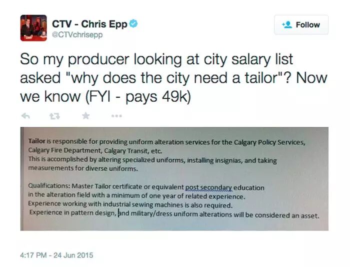 裁缝的年收入还不错:$49,631-$66,339,当CTV的记者Chris看到这个清单时,也产生了疑惑,还发了Tweeter~