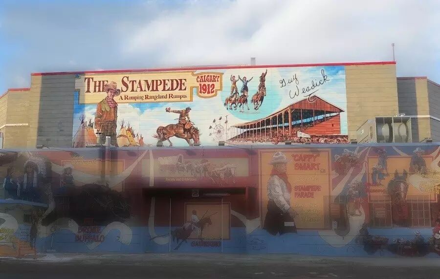 这幅壁画向我们展现了上个世纪的早期岁月(1912—1919),当牛仔节开幕式花车巡游时的情景:水牛群、皇家骑警乐队,以及巡游领队:消防队长卡皮‧斯马特(Cappy Smart)。