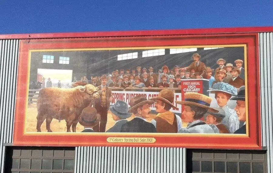 这幅壁画专为纪念100周年前的1901年首次 公牛拍卖而作。1901年4月12日,当地纯种公牛饲养人协会(Territorial Purebred Cattle Breeders Association)在维多利亚公园边上的牛棚里举行了第一次公牛拍卖,一共卖掉64头纯种公牛。来自本省拉孔波(Lacombe)的佩斯利(Paisley)担任拍卖官。平均每头售价:$85.17加元。