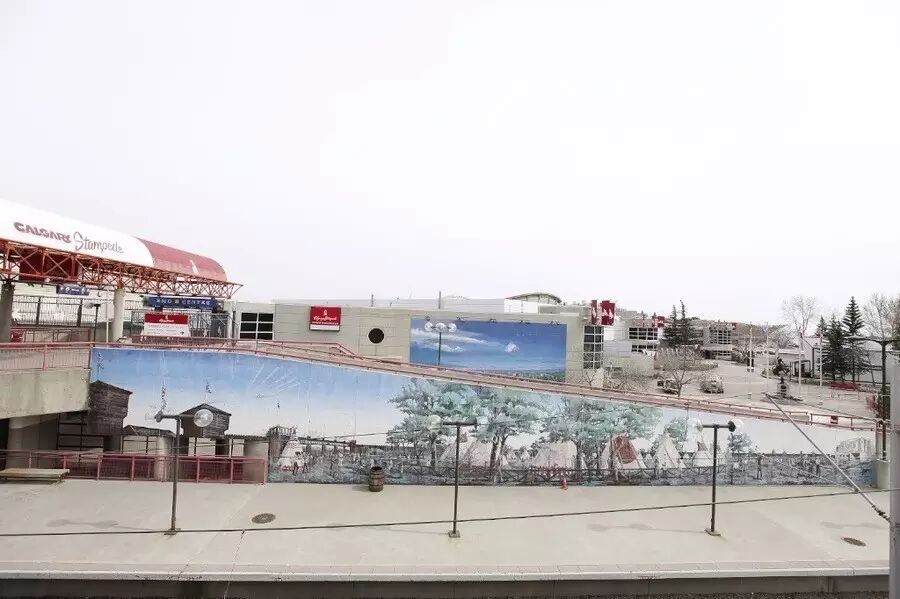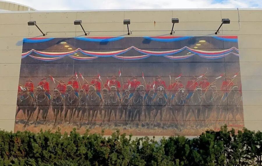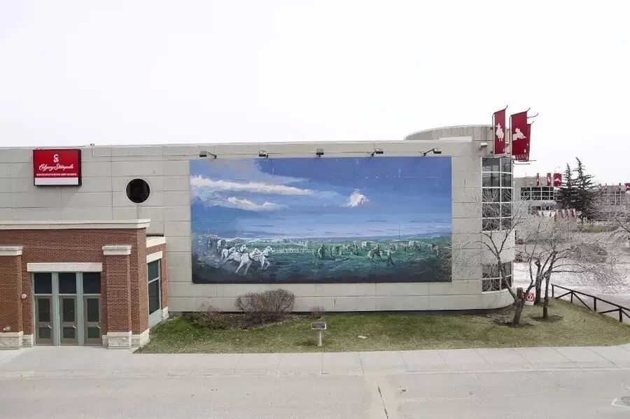 这幅壁画展示了在卡尔加里维多利亚公园“马匹展示竞技场”上的骑警雄姿。这幅作品专为庆祝西北骑警“西进”之队成立125周年而作,同时庆贺皇家骑警85年前首次驻扎卡尔加里。