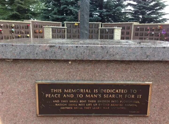 在雕像的基座上,有这么一句话:“This memorial is dedicated to peace and man’s search for it.”