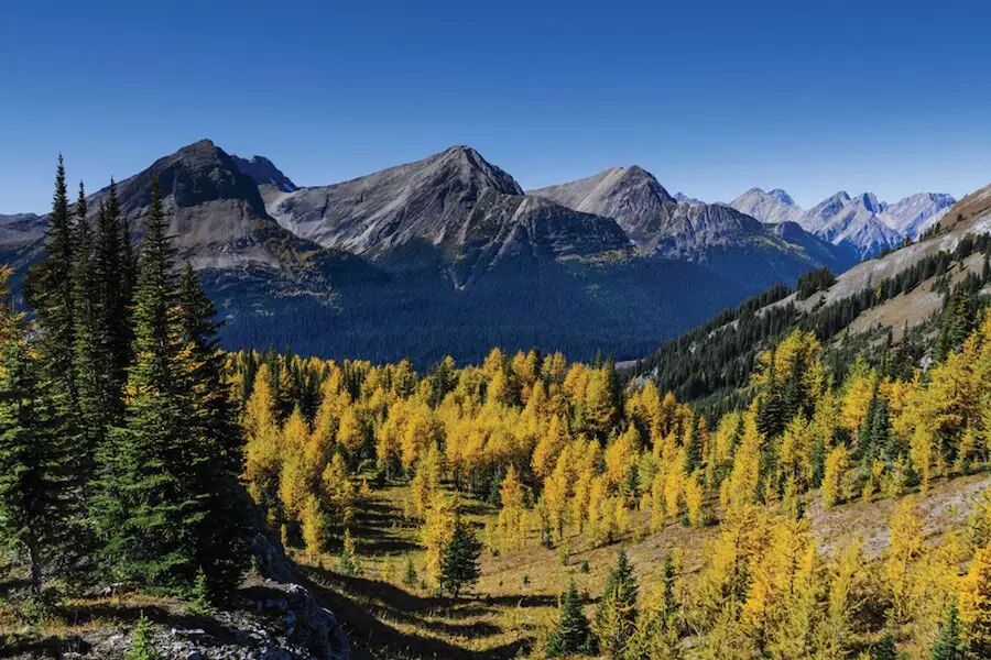 Larch(落叶松)与别的常绿松树不同,秋季来临之时针叶会变成明黄色。加拿大的落基山深秋被这些金色或者琥珀色的松树装点得绚丽多彩。