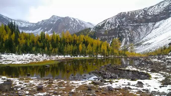从这儿以后的trail虽然不像树林中的有那么多烂泥,但是很多地方下面是石头,上面是冰雪泥,同样的滑。不一会儿就来到小池塘旁边,一汪静水倒影着雪山金松。