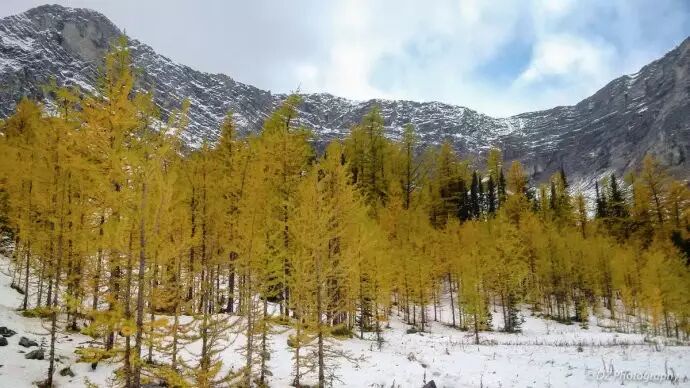 资料上说,只要走半小时就可以走出树林到达开阔地带,正常情况下是很容易的事,可泥泞增加了几倍的难度,走到快半小时的时候还在树林里,我望着前面不知延伸到哪里的窄窄的滑滑的甚至向下倾斜的trail,既然在泥泞里跋涉那么多了,那就坚持一下吧。果然又走了5分钟左右,面前豁然开朗,一排排灿烂的金松衬托着壮丽的雪山出现在眼前。
