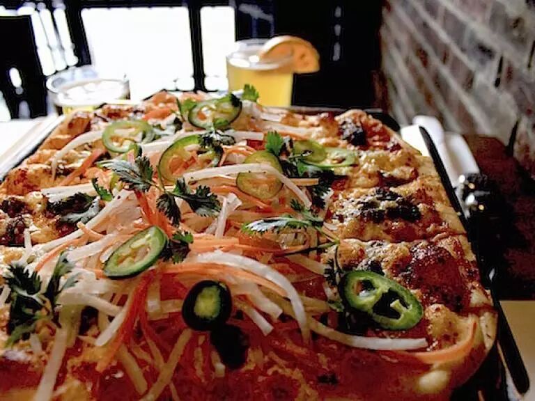 Bánh Mì是一款经典的三明治,非常融合菜式的典范,它用了法式的面包和越南式的馅料。这款Pizza进一步改良,加了肋排,腌红白萝卜,墨西哥辣酱还有香菜。