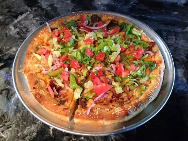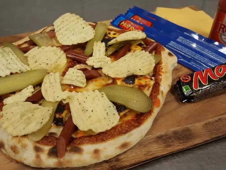 这是一款芝麻脆边Pizza,真的有炸薯条,反正汉堡有的元素都有,还有牛肉,洋葱,腌菜,生菜,西红柿,培根,Cheddar chesse和酱料。