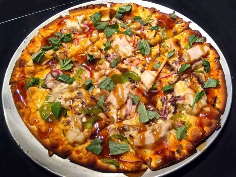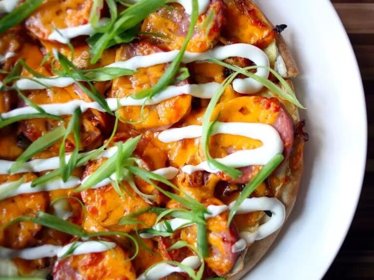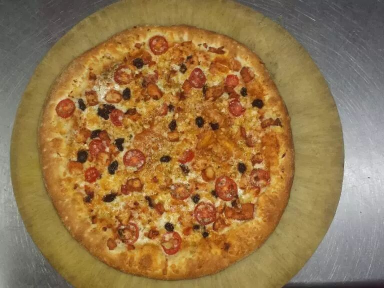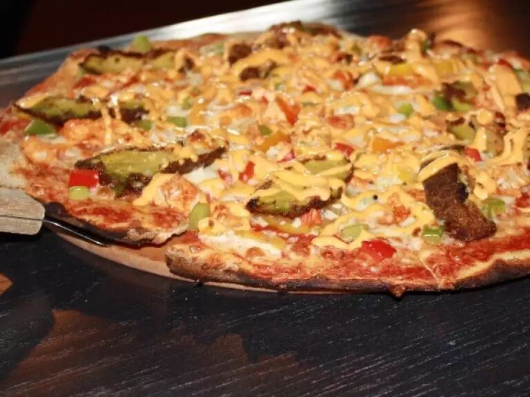 这款披萨可以当做前菜,面包屑裹煎牛油果,cajun香辣鸡肉,黄辣椒,蒜泥蛋黄酱加上mozzarella chesse。