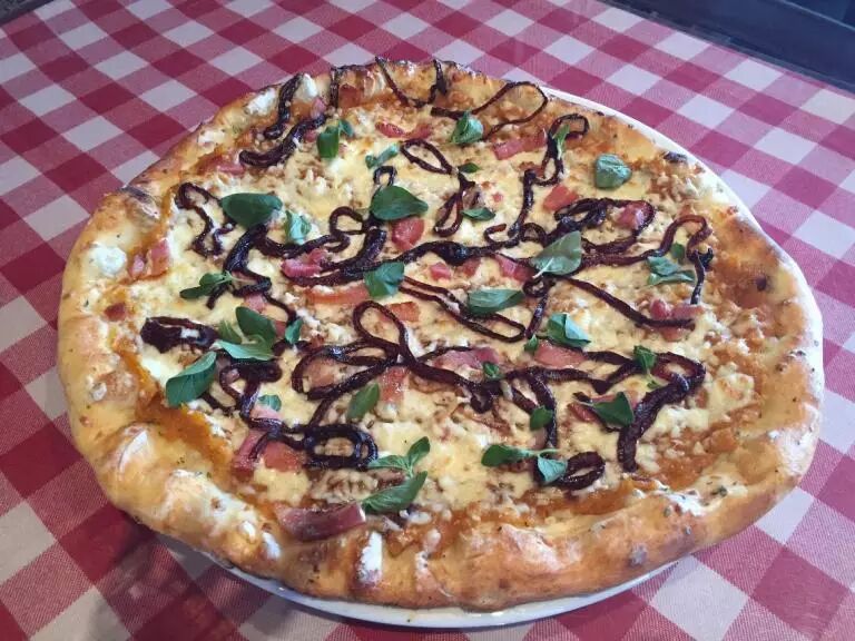 有没有试过土豆Pizza?馅料包括鲜奶油,fior di latte奶酪,烤土豆片,意大利烟肉,鸡蛋,焦糖洋葱,迷迭香,罗勒叶和干酪。