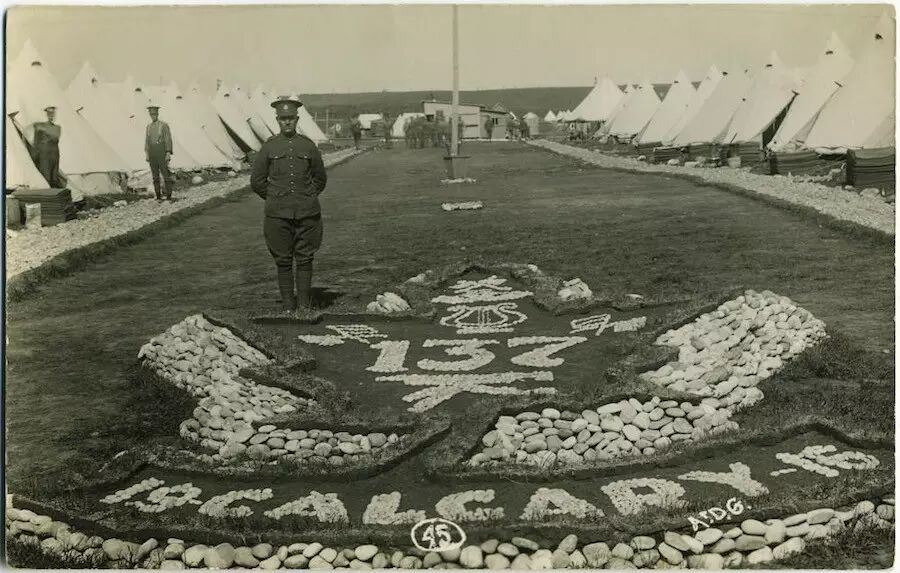 113远征军1916年最初在Lethbridge训练,同年5月他们来到了Sarcee大营。自1914年起,这里是加拿大国民军从Sarcee印第安保留地(现为Tsuu T’ina)租用的训练营。