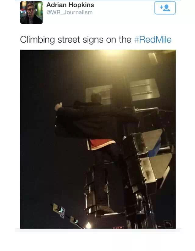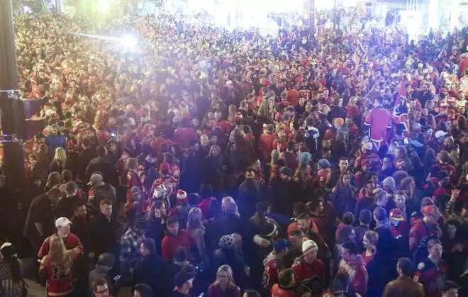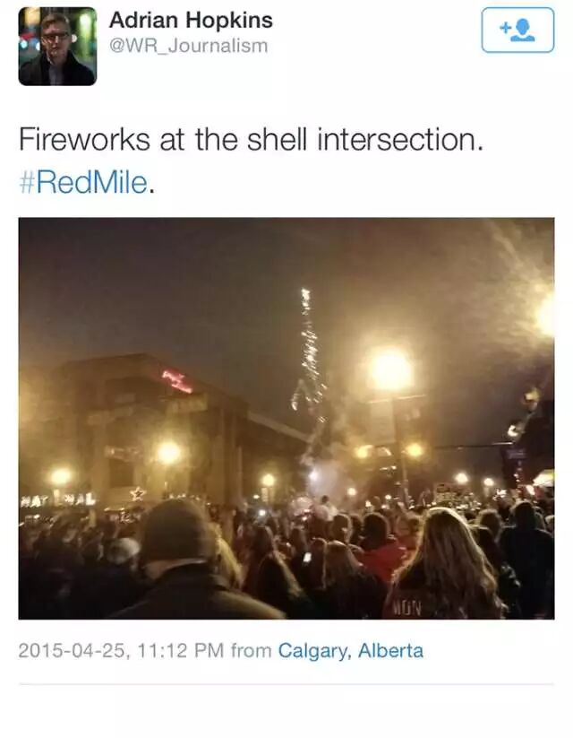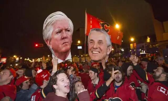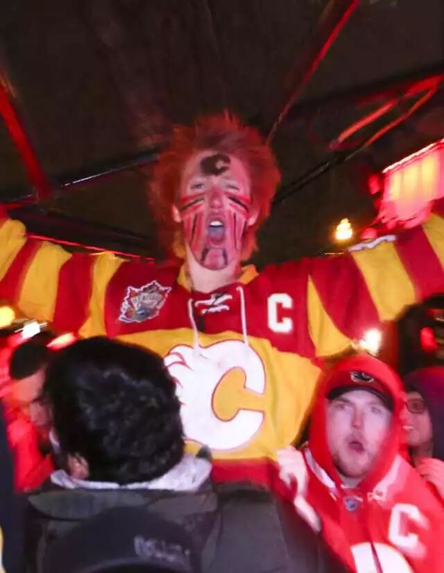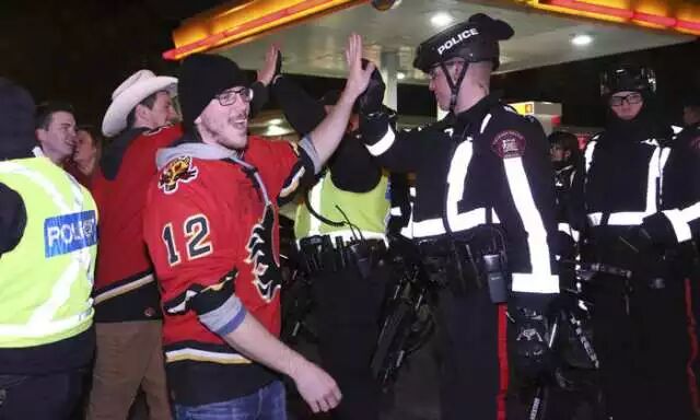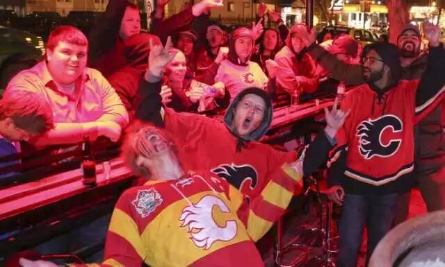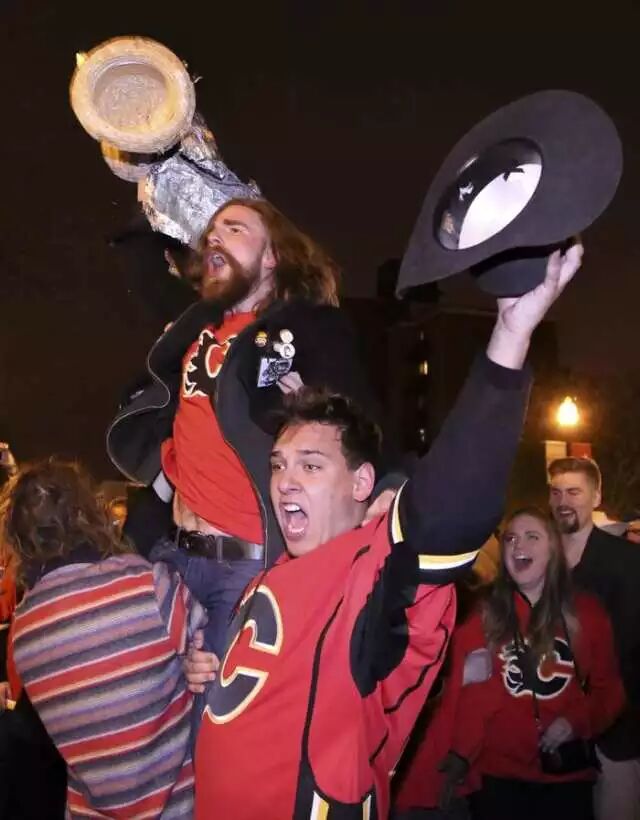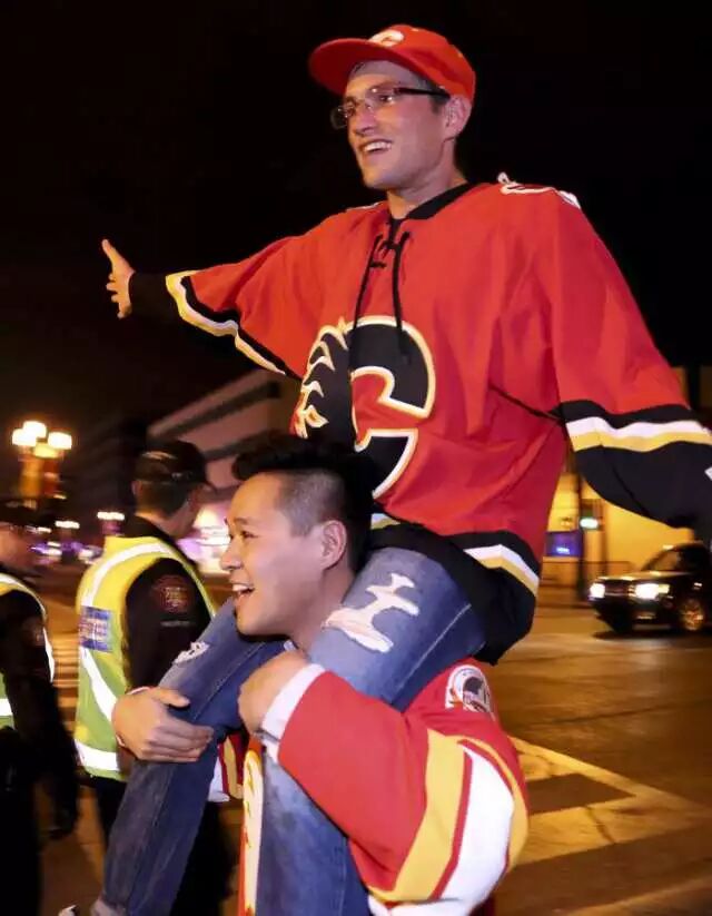 这晚大概有10,000到12,000的Flames粉丝从市中心酒吧到Saddledome的街道上庆祝胜利,他们喊口号,喝啤酒,唱歌,舞蹈,不能欢乐更多~!