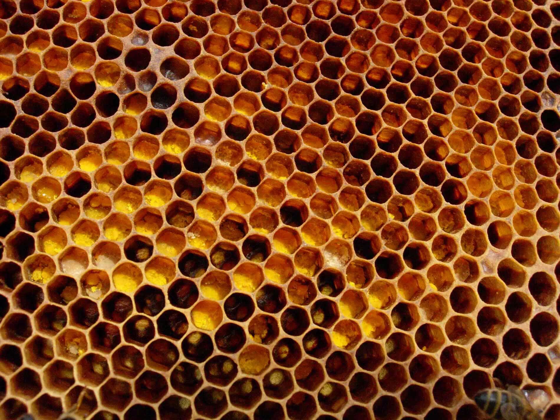 蜂巢中的蜜。结有白色蜡盖的是熟蜜,无封盖的为水蜜