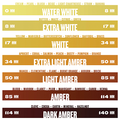 先说white,加拿大规定在英制蜂蜜颜色表上低于30mm的色泽可称为White。不黑认为这一条纯属蛋疼,因为蜂蜜的色泽跟品质毫无关系,荞麦蜜本身就是酱褐色的。