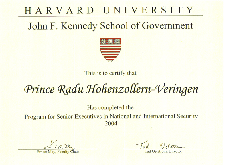 上图为罗马尼亚王子的哈佛肯尼迪学院学位证书