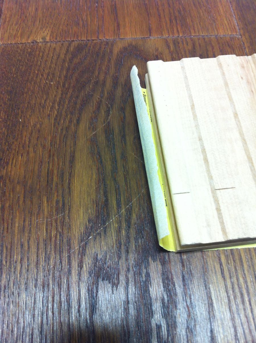 包3寸木地板压紧顺木纹轻轻来回磨3-4次,也可以用手按住沙纸将刮痕轻轻磨去,不要将原来的色磨掉。清干净尘。