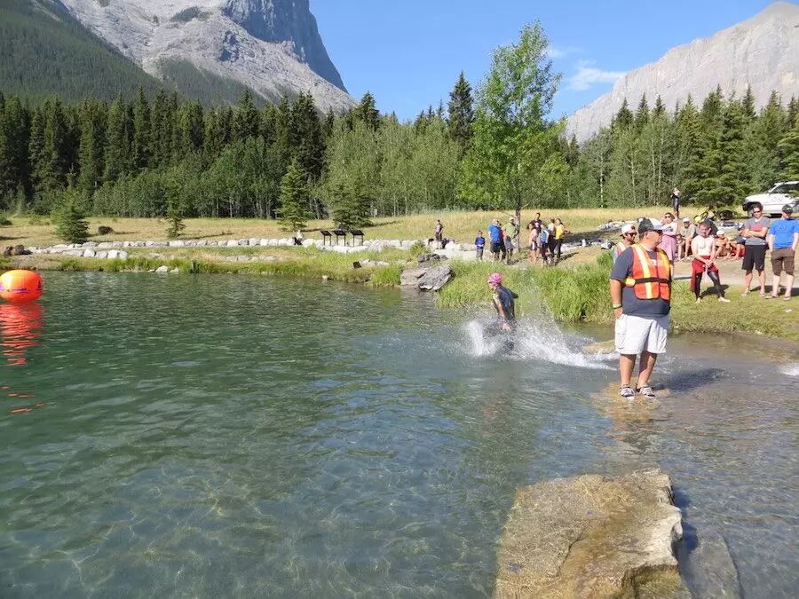 四面环山,360度无敌山景,Canmore Quarry lake是我省能游泳的最棒的湖泊之一。他的水源来自地下泉,不像其他山地湖泊源头是冰川寒冷刺骨。这里还有很多高崖,深潭可以玩跳水。