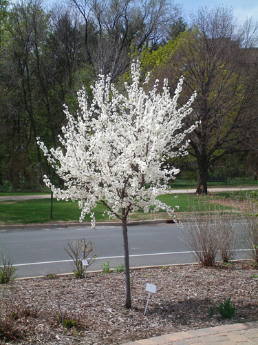 以Schubert Chokecherry为例,成熟尺寸8米(高)X 4(米)宽,鸡蛋型树冠,早春开小白花,有香味。绿色新叶很快变成焦红色,结黑色小果,果实可吸引鸟类。