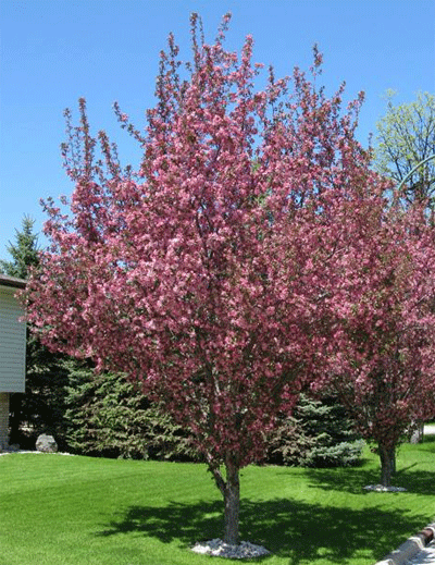 此类树形娇小,先开花后长叶,粉红色花朵茂密艳丽,结深红色小果实,是广受喜爱的观赏树种。