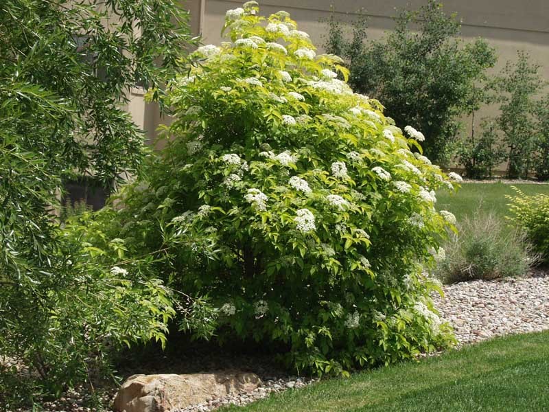 Golden Elder, 成熟尺寸3米(高)X 2.5米(宽),生长迅速,叶片金黄色,成串白花夏天开放,秋季结小红果。