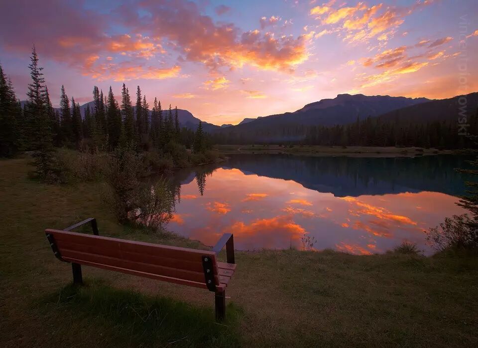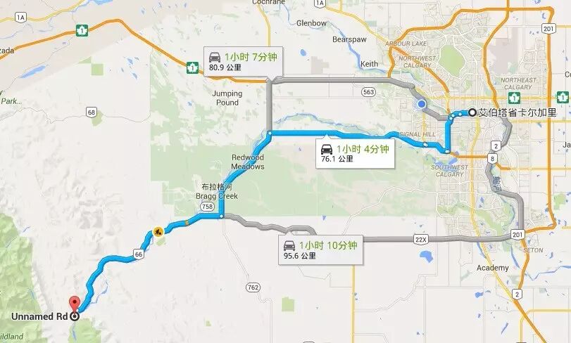 卡城西南有一个小镇Brag Creek,离卡城不到50公里,在22号公路旁边。继续在22号公路驾车转上66号公路,向南行驶大约20分钟,向左拐入小多宝河地区(Little Elbow),向前500米,就来到勿忘我湖。