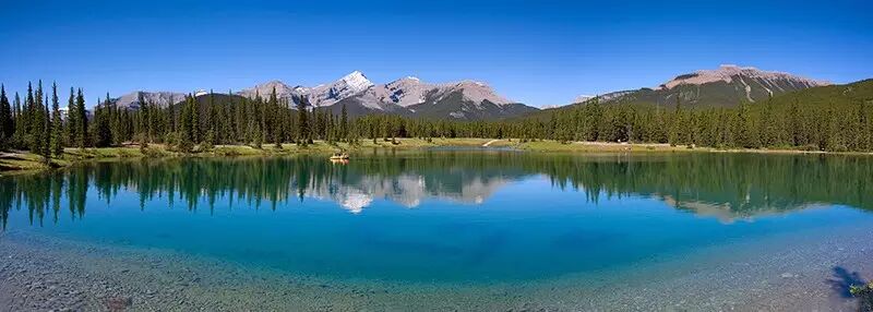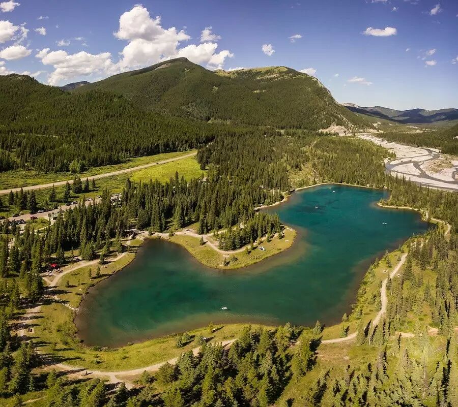 勿忘我湖就在Elbow River边上,千年以来,一直有猎人和渔夫在河岸边驻扎。为了让更多人享用这块宝地,于是建设宿营场地。在建设过程中,工地挖出很多碎石,慢慢堆积起来。几过经年,这地方竟汇集了落矶山上的雪水,形成了宝石蓝色清澈湖水的勿忘我湖,
