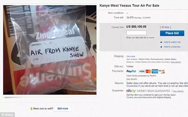 最疯狂的一件事是,一袋在嘻哈歌手Kanye演唱会上采集的空气,最后在Ebay上拍出了$60,100的高价。