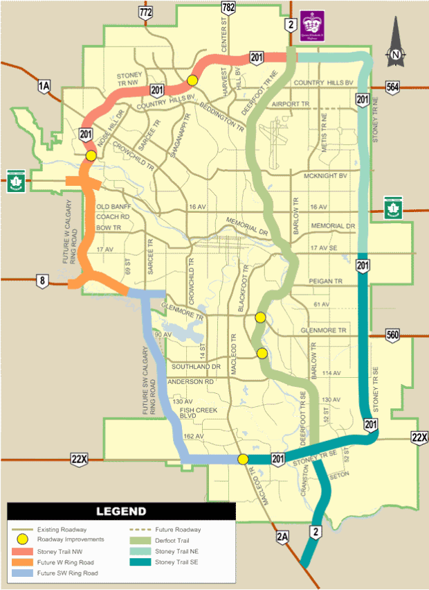 西南的环线将沿着卡城的西侧边界,从22X高速路,穿过Tsuu T’ina族的领地至8号高速路,然后沿着101st的狭长地带接入横贯加拿大高速路。