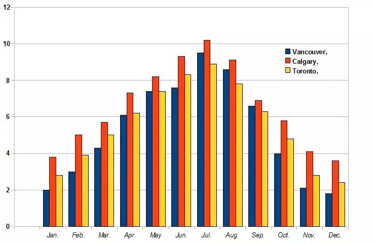 卡城/温哥华/多伦多三城市全年日照时间比较