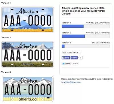Alberta很快就会换掉车牌上的口号‘Wild Rose Country’(野玫瑰之乡),采用新的设计。7月份,人们被邀请去网站投票,以选出一款设计换掉已经使用了30年的旧车牌。第二款设计得票最多。