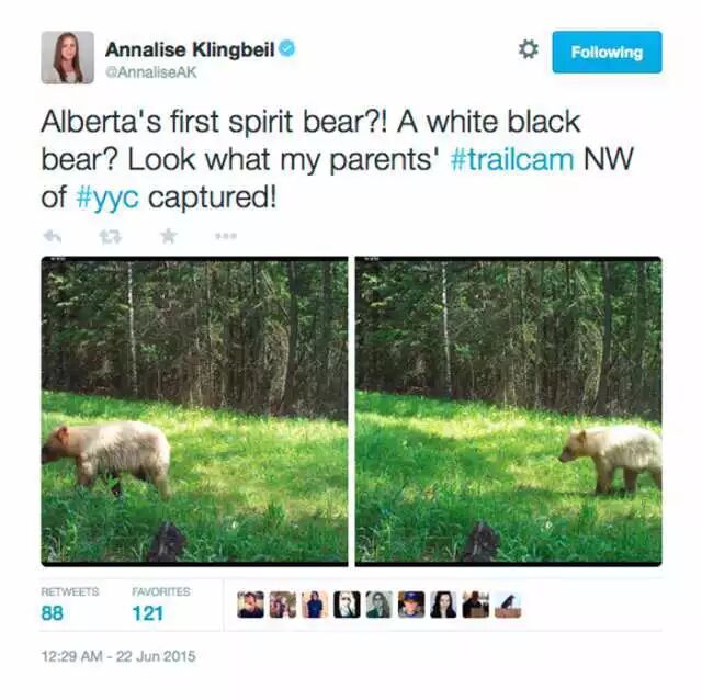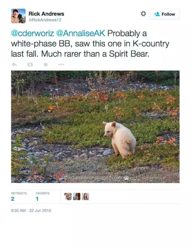 而且这种熊并不少,但确实罕见,去年摄影师Rich Andrews就在Kananaskis拍到了白色的黑熊: