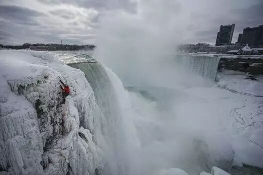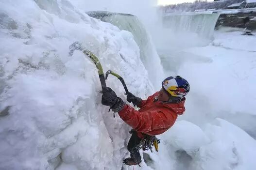Gadd从左面高150英尺,宽30英尺的峭壁爬上这个堪称最壮观的瀑布。多亏了今年的寒冬低温,否则绝无可能爬上尼亚加拉。
