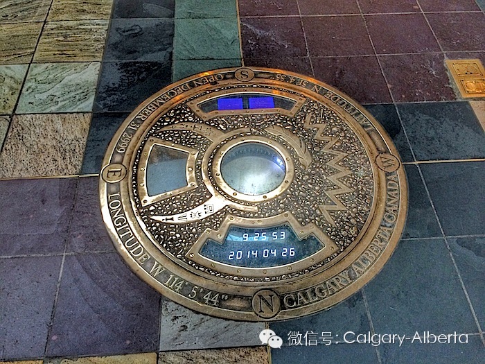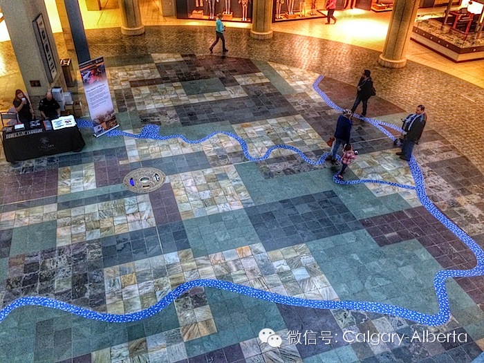 地面蓝色的马赛克,勾画出卡城两条母亲河Bow River和Elbow River的水系图